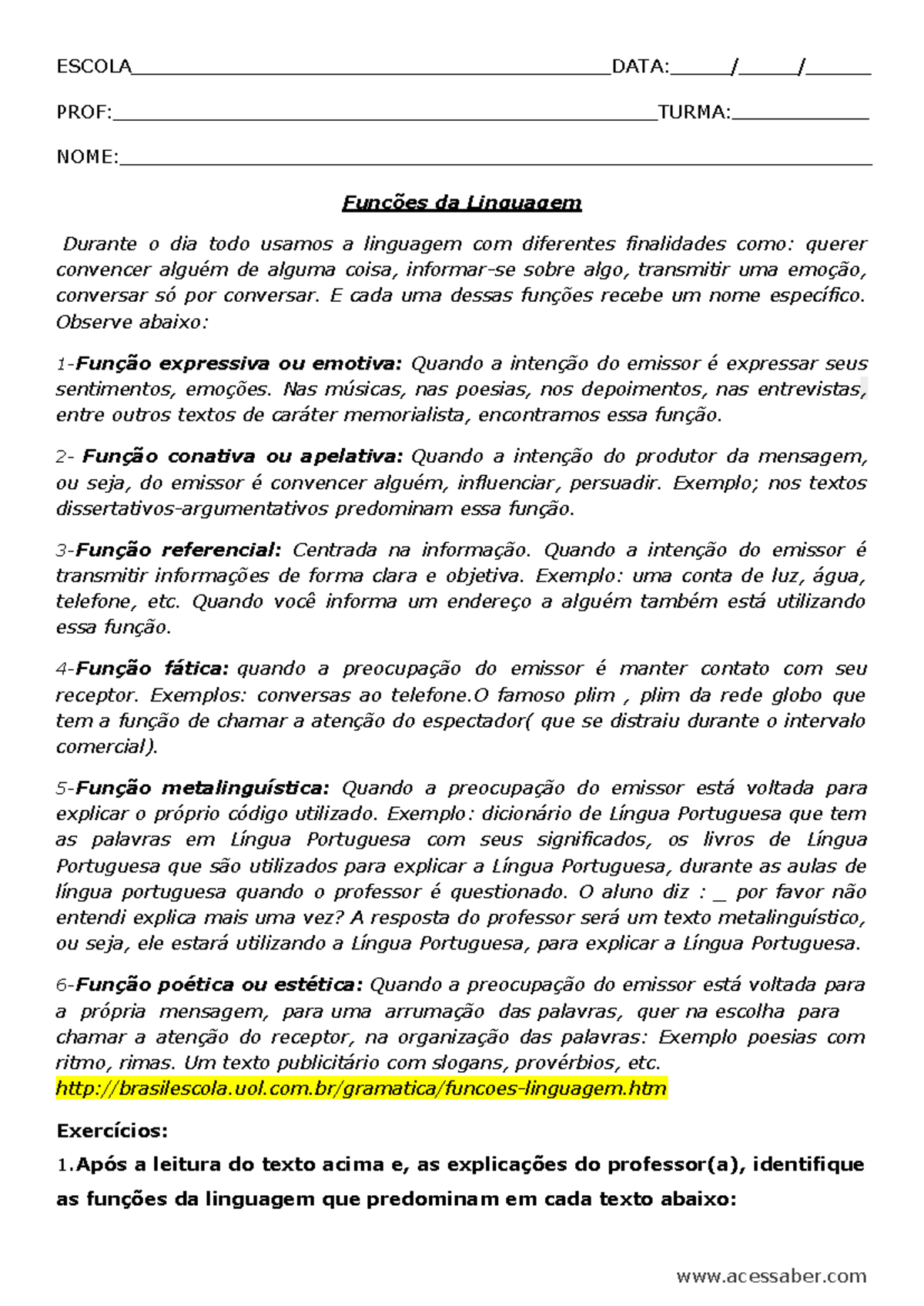 Atividades Funções Da Linguagem 1 Ano Ensino Médio Com Gabarito