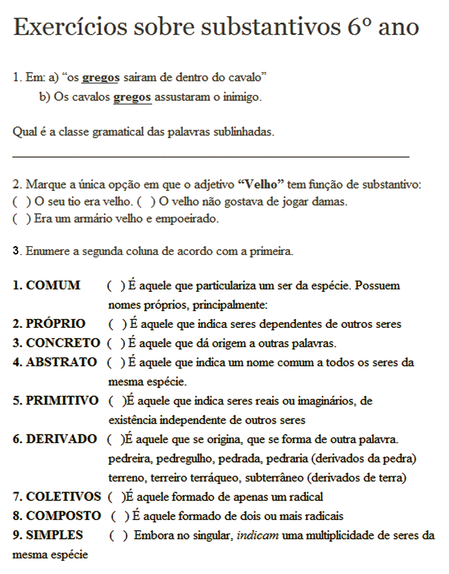Flexão do Substantivo (2). Flexão dos Adjetivos (1).Atividades substantivos 6 º ano fundamental com gabarito . Caro estudante, antes de realizar as atividades a seguir, CLIQUE AQUI e revise alguns conceitos básicos sobre os substantivos .
