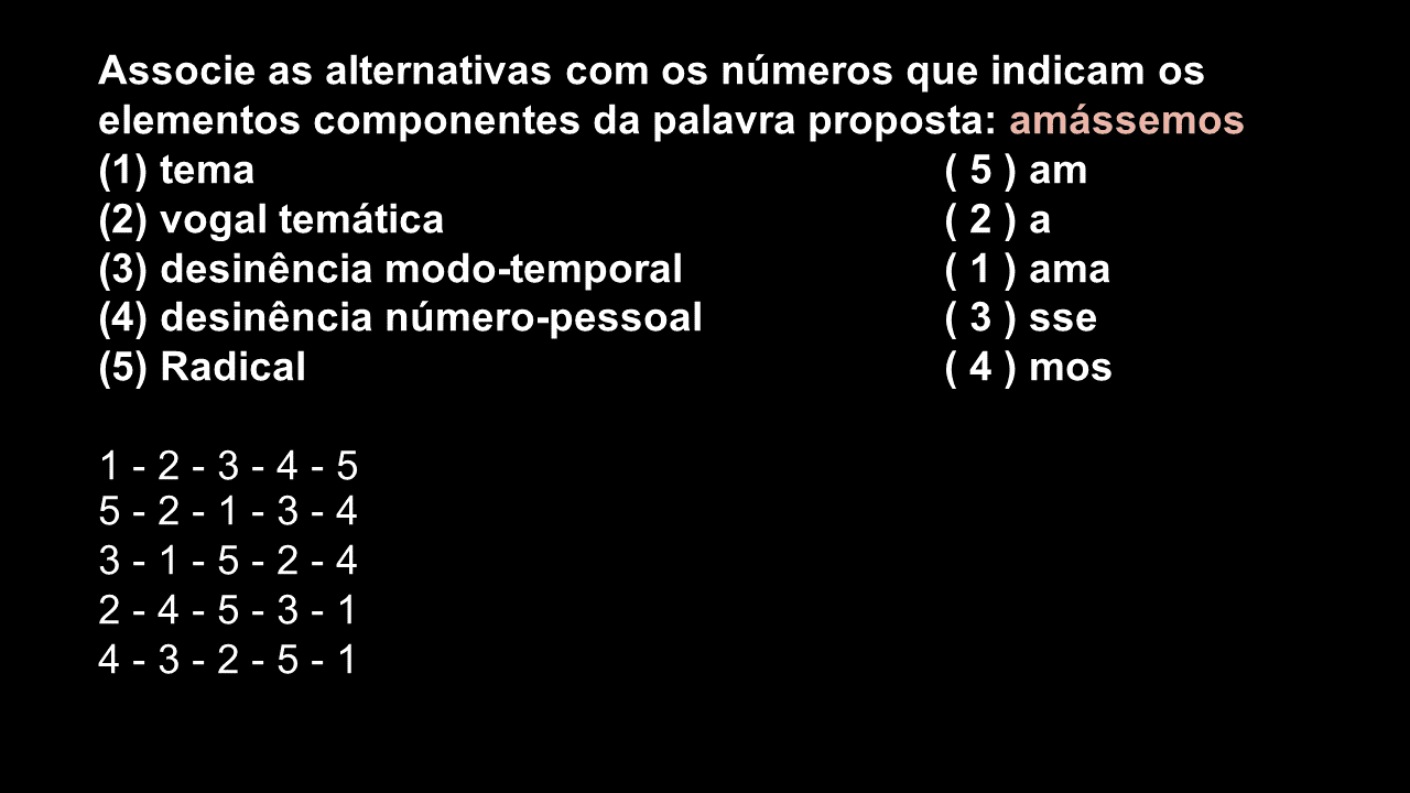 10. Indique a ordem correta dos morfemas na palavra deslealdade. ( A ) prefixo e radical.11. Identifique os morfemas gramaticais sublinhados das seguintes palavras : 1. brincassem ( ) Desinência nominal de número.
