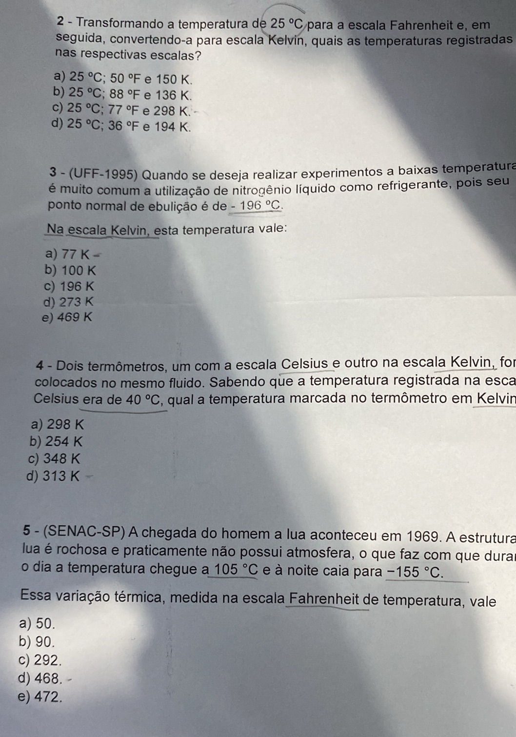energia em trânsito, do corpo mais frio para o mais quente. 6. Transformando a temperatura de 25 ºC para a escala Fahrenheit e, em seguida, convertendo-a para escala Kelvin, quais as temperaturas registradas nas respectivas escalas ? a) 25 ºC; 50 ºF e 150 K. b) 25 ºC; 88